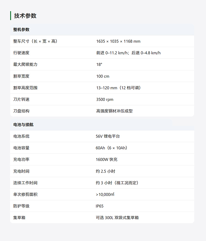 - ● 長效續(xù)航能力:60Ah 大容量電池平臺(tái),2.5 小時(shí)快充,單次修剪面積可超過 10,000㎡。
